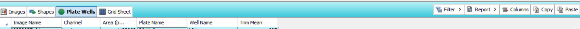 Ensure that in the Plate Wells table you have the columns shown in the image below. You will need at least the Image Name, Channel, Area, Plate Name, Well Name, and Trim Mean. Depending on your setup, you may need to add/remove any number of columns. To add a column, in the Plate Wells table, click Columns and select the column to add. To remove a column, unselect it.